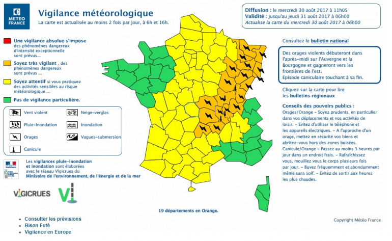 Météo France place 19 départements en alerte orange aux orages mercredi 30 août 2017