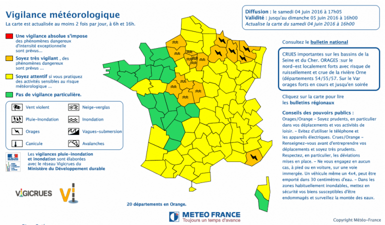Météo France a placé cinq départements en vigilance orange aux inondations samedi 4 juin au matin. Il s'agit de l'Eure, la Meuse, la Meurthe-et-Moselle, la Moselle et la Seine-Maritime. Cinq départements du nord-est de la France avaient aussi été placés en vigilance orange, mais pour des orages : la Moselle, la Meurthe-et-Moselle, la Meuse, la Marne et les Ardennes. Le Var a été rajouté à cette liste samedi à 17 heures.