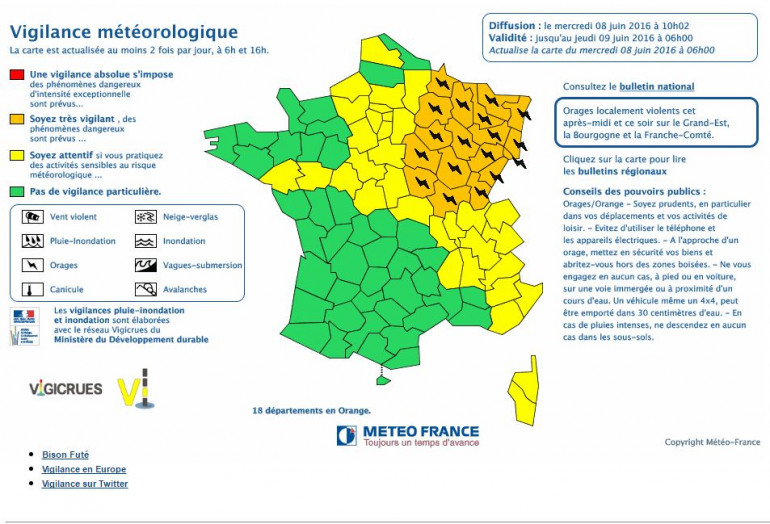 Dès midi ce mercredi 8 juin 2016 un épisode orageux particulièrement violent est attendu dans l'est de l'Hexagone. Les 18 départements suivants ont été placés en alerte orange aux orages par Météo France dans son bulletin de vigilance matinal : les Ardennes (08), l'Aube (10), la Marne (51), la Haute-Marne (52), la Meurthe-et-Moselle (54), la Meuse (55), la Moselle (57), les Vosges (88), le Bas-Rhin (67), le Haut-Rhin (68), la Côte-d'Or (21), la Nièvre (58), la Saône-et-Loire (71), l'Yonne (89), le Doubs (25), le Jura (39), la Haute-Saône (70) et le Territoire-de-Belfort (90).