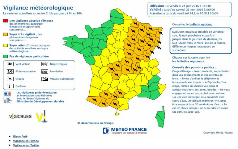 De nouveaux orages sont à prévoir dans toute la France. Météo France a placé pas moins de 31 départements en alerte orange aux orages. Un phénomène attendu dès 18 heures ce vendredi 24 juin et qui devrait s'achever le lendemain matin à 4 heures voire 13 heures pour certains départements du Nord-Est. Des épisodes pluvieux et orageux "nécessitant une vigilance particulière compte tenu de la forte probabilité de phénomènes violents", a expliqué l'organisme météorologique sur son site internet.