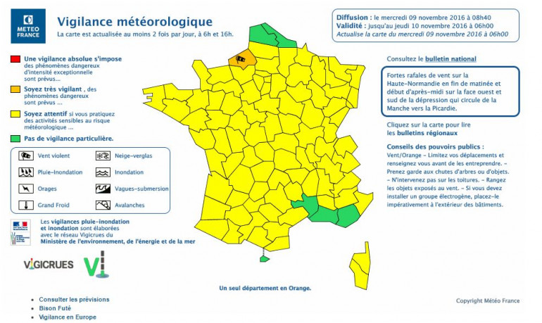 Après l'arrivée du froid et même de la neige en début de semaine, c'est au tour du vent de venir toucher la Haute-Normandie. Météo France a placé le département de la Seine-Maritime en vigilance orange mercredi 9 novembre en fin de matinée et en début d'après-midi, notamment entre 10 et 15 heures, en raison de fortes rafales de vent venant de la face ouest et sud de la dépression qui circule aujourd'hui de la Manche vers la Picardie.