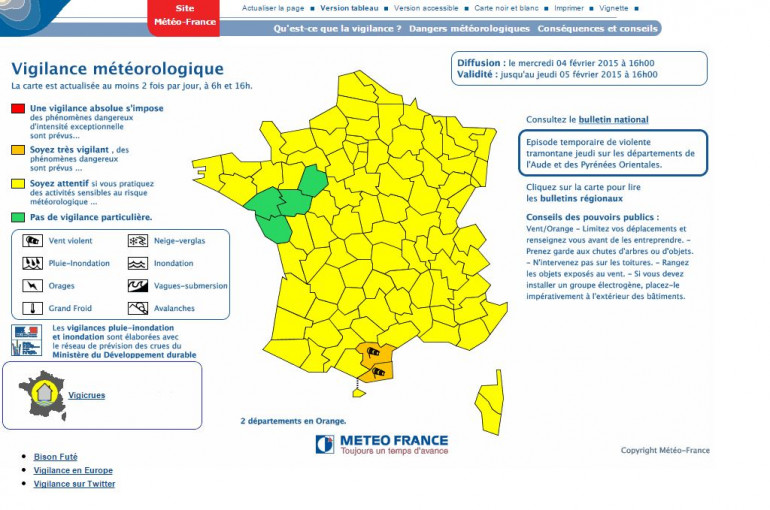 Des vents violents avec des pointes à plus de 150 km/h sont attendus dans le sud de la France annonce Météo France dans son bulletin de vigilance de 16 heures mercredi 4 février 2015. Cet épisode venteux touchera deux départements placés en vigilance orange "vent violent" : l'Aude (11) et les Pyrénées-Orientales (66).