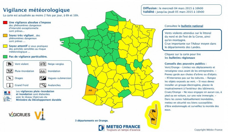 Météo France a déclenché ce mercredi 4 mars la vigilance orange sur les deux départements de la Corse, soumis à des vents violents, et maintenu l'alerte orange sur les Landes, la crue de l'Adour poursuivant sa propagation dans le secteur de Dax.