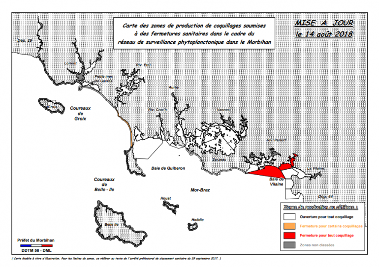 C'est pourquoi, la pêche, le ramassage, le transport, le stockage et la commercialisation de tous les coquillages, provenant de plusieurs zones, est interdit. Cela concerne les secteurs de la baie de Kervoyal, de l'étier de Billiers et du littoral damganais, a précisé la préfecture du Morbihan dans un communiqué.