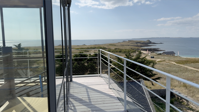 Actuellement, seule une petite partie du rez-de-chaussée reçoit le public. L’énorme atout du sémaphore de l’île de Hoëdic, c’est son fameux belvédère, au 2e étage. On accède par un escalier, avec des cartons protecteurs sur les marches en ce moment, à une bulle en verre puis à la terrasse. Elle recevra 19 personnes.