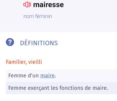 Définition de "mairesse" sur le dictionnaire Larousse en ligne.