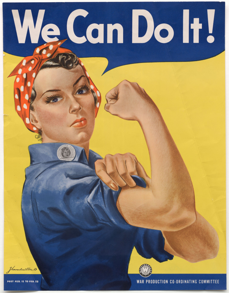 "On peut le faire !", scande l'un des emblèmes les plus célèbres des luttes féministes. Célébrant le travail des femmes pendant la Seconde Guerre mondiale, l'affiche aux couleurs vives montre une jeune femme de profil en tenue bleue d'ouvrière, sur un fond jaune, retroussant sa manche pour montrer la force de son biceps et proclamer "We Can Do It!".