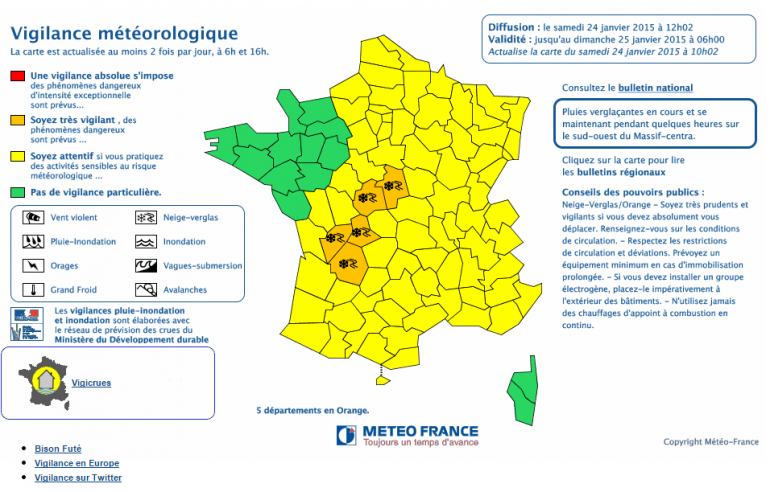 Le bulletin de vigilance orange de Météo France du samedi 24 janvier 2015 à la mi-journée.