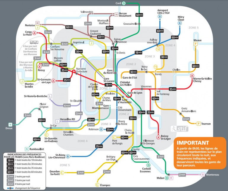 Après minuit 30, les lignes du RER A, B, C et D fonctionneront toute la nuit, mais à différentes fréquences, visibles sur le plan ci-dessous. Les lignes des trains H, J, L, N, P et R circuleront aussi toute la nuit à des fréquences réduites. Les trains et RER desserviront toutes les gares de leur parcours, mais circuleront dans le sens Paris-banlieue sur certaines branches (à l’exception des lignes A et B qui rouleront dans les deux sens).