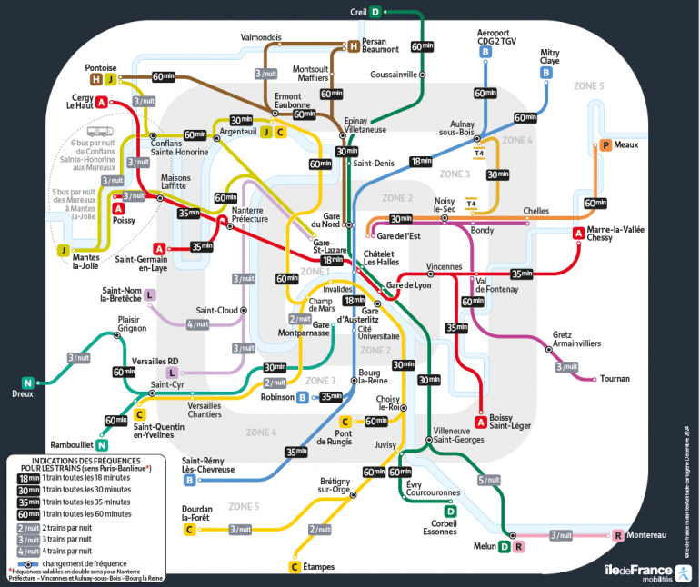 Le plan des lignes de RER / trains / tram en circulation pour la nuit du 31 décembre 2024 .
