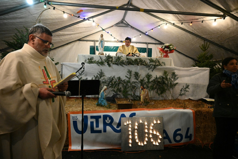 Des prêtres célèbrent une messe de la veille de Noël sur l'autoroute A64, le 24 décembre 2025