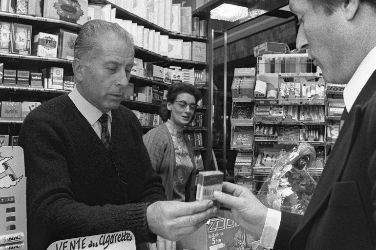 Un client achète le 13 mai 1975, un paquet de cigarettes chez un buraliste, à Paris. (illustration)