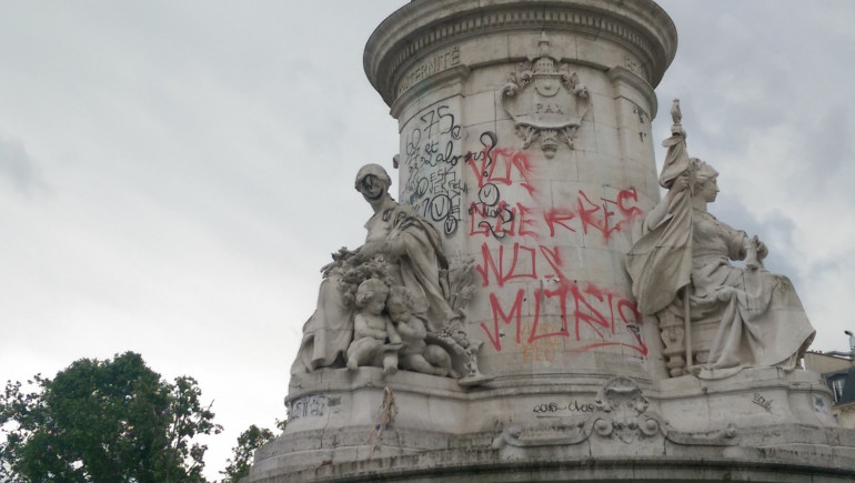 Émeutes lors de la COP21, naissance du mouvement "Nuit Debout", contestation contre la loi Travail... Le contraste avec l'émotion post-attentats est saisissant. Il suffit de faire quelques pas autour de la statue pour passer des témoignages de respect envers les victimes à, quelques mètres plus loin, des messages de revendications politiques sans aucun lien. À l'image d'un gigantesque : "Vos guerres, nos morts" inscrit en rouge au milieu de l'édifice ou des tags contre l'utilisation de l'article 49.3 de la Constitution.