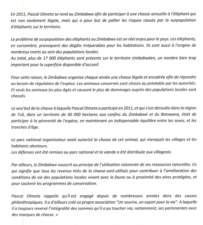 En décembre 2011, afin de pallier les dommages causés par la surpopulation d'éléphants au Zimbabwe, Pascal Olmeta a participé à une chasse légale et encadrée par le parc organisateur. Né dans une famille de chasseurs, Pascal Olmeta ne s'est jamais caché de pratiquer la chasse. Il a d'ailleurs de nombreuses fois répondu à des interviews et fait la couverture de supports spécialisés.