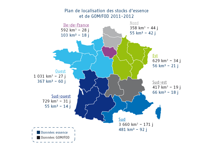 Les réserves stratégiques sont situées dans des entrepôts douaniers, répartis sur toute la France afin de couvrir au maximum l'ensemble du territoire. Plus précisément, la localisation des stocks est faite de telle manière à ce qu'il y ait au minimum 10 jours de consommation d'essence dans chacune des sept zones de défense (circonscription administrative liée à la sécurité nationale). À noter que le dépôt le plus important se situe près de Manosque (Alpes-de-Haute-Provence), au milieu du parc naturel du Luberon.