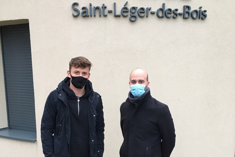 Pierrick Capelle (à gauche), footballeur professionnel et conseiller municipal devant la mairie de Saint-Léger-de-Linières (49), en compagnie du maire.