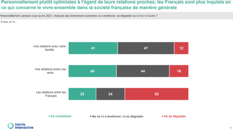 2020 a ainsi profondément marqué les Français, qui, malgré certaines perspectives positives, restent majoritairement pessimistes pour 2021. Si sur le plan personnel, ils ont plutôt l’impression que les prochains mois pourront les rapprocher encore de leurs familles (41%) ou de leurs amis, (40%), ils envisagent avec des doutes les questions de cohésion sociale au sein de la société française : 53% estiment que les relations entre les Français vont se dégrader au fil des mois.