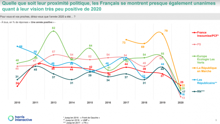 Depuis le début du baromètre fin 2009, l’impression d’une année négative n’avait jamais dépassé les 54%, avec des oscillations ne dépassant jamais 8 points d’une année sur l’autre. 2020 s’oppose ainsi radicalement aux années précédentes et marque une rupture de positionnement de la part des Français, qui rêvent essentiellement pour l’année 2021 de pouvoir passer à autre chose, de voir la pandémie se terminer et de pouvoir reprendre une vie plus normale.