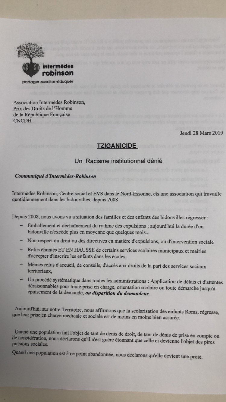 L’association Intermède Robinson basé à Chilly Mazarin est une association humanitaire qui a pour but d’intégrer et d’offrir une aide aux personnes exclus qui vivent par exemple dans les hôtels sociaux ou dans des bidonvilles de la banlieue parisienne. Parmi ces personnes de nombreux Roms. L’organisation a donc publié un communiqué afin d'alerter sur les conditions de vie de cette communauté.