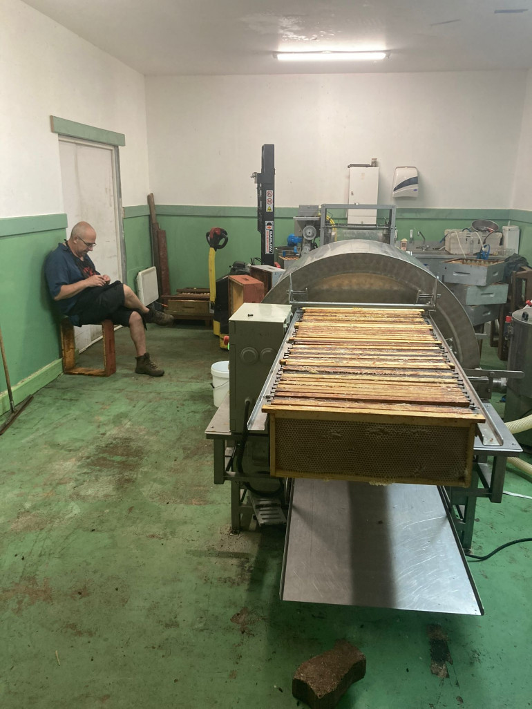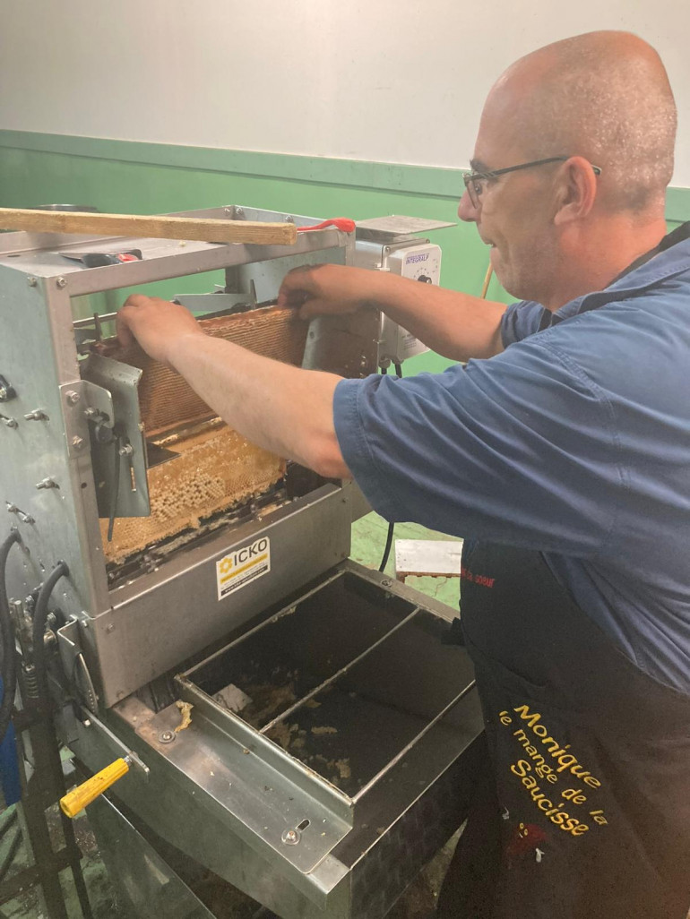 Après 2 heures de travail, nous rentrons à l'atelier. Il s'agit d'un petit hangar situé dans une zone industrielle. Il faut maintenant extraire le miel. Tout est en partie automatisé. L'apiculteur place les rayons récoltés dans une grande machine. Il s'agit d'un extracteur, qui tourne très vite et qui grâce à la force centrifuge, permet de récupérer le miel dans de grandes bassines.