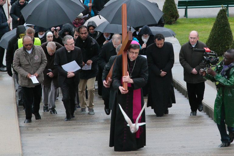 Monseigneur Éric de Moulins-Beaufort préside un chemin de croix du Jeudi Saint à Paris le 25 mars 2016