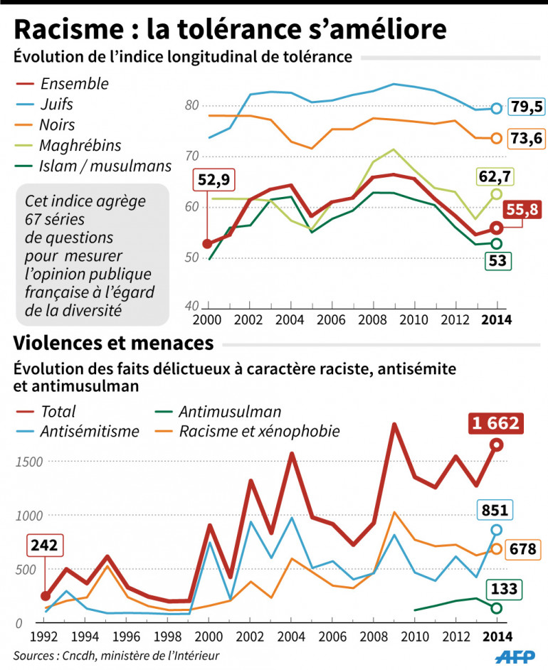 Après quatre années de baisse consécutive, l'indice de tolérance, calculé à partir d'une série de questions posées aux sondés, marque une stabilisation, voire une légère progression. La proportion de Français se déclarant "pas racistes du tout" est en hausse pour la première fois depuis 2010, atteignant 43%, selon un sondage de l'institut BVA pour la CNCDH réalisé du 3 au 17 novembre 2014 auprès d'un échantillon représentatif de 1.020 personnes.