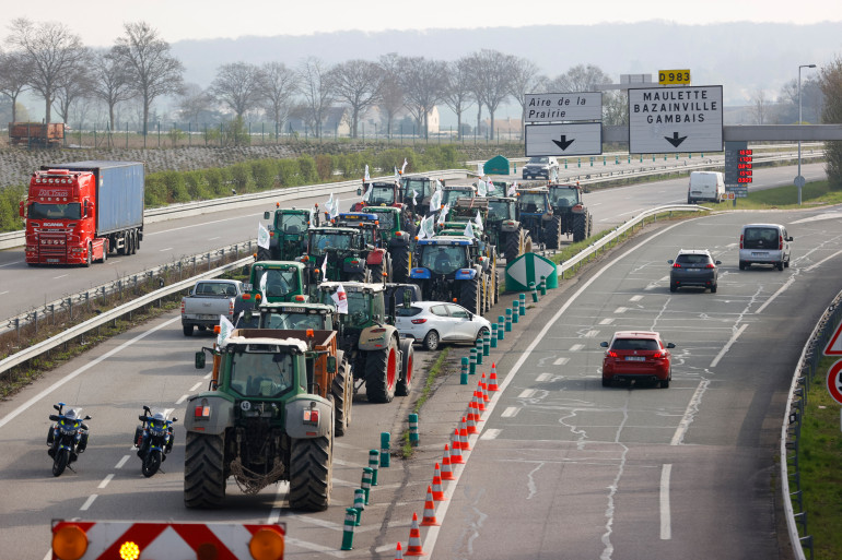 Opération escargot en cours. Des files de tracteurs bloquent certains axes stratégiques de la Normandie à la Champagne-Ardenne, en passant par l'Île-de-France et les Hauts-de-France depuis le début de la matinée ce vendredi 2 avril. Selon le président de la Fédération nationale des syndicats d'exploitants agricoles (FNSEA) Grand bassin parisien, Damien Greffin, ils étaient quelque 5.000 agriculteurs en colère à manifester ainsi à 9 heures.