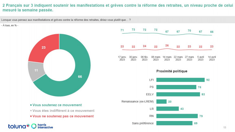 Aussi, 66% des Français indiquent toujours soutenir ce mouvement de contestation, soit un niveau très proche de celui mesuré il y a une semaine. Dans ce contexte, 60% des Français souhaitent que les organisations syndicales continuent à appeler à la mobilisation, une petite progression de 2 points par rapport à la semaine dernière.