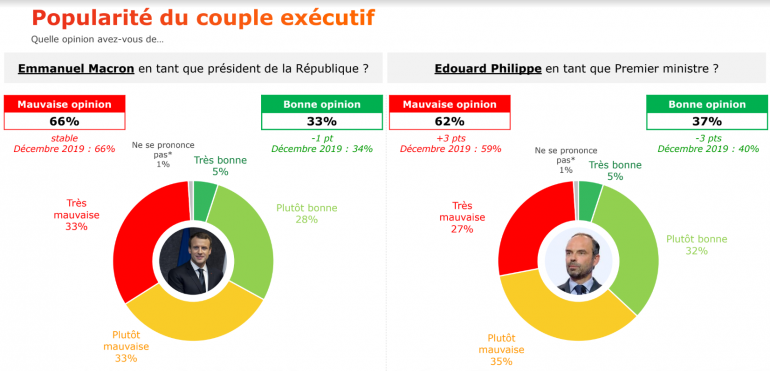 Emmanuel Macron pâtit un peu moins de la situation et sa cote de popularité est relativement stable : 33% des Français déclarent avoir une bonne opinion du chef de l’État (-1 point par rapport à décembre), contre 66% (inchangé) qui en ont une mauvaise opinion. Notons toutefois que sa cote de popularité s’étiole : il a ainsi perdu 4 points depuis octobre.