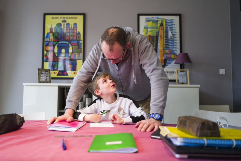 Un père et son fils pendant une séance d'école à la maison à Mulhouse