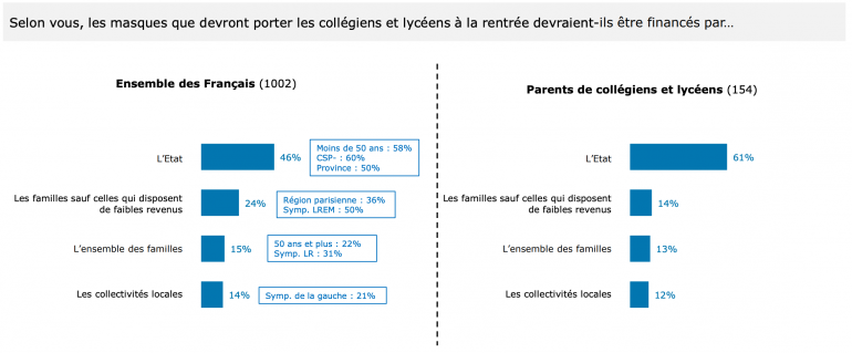 14% des personnes interrogées jugent que c’est aux collectivités locales de supporter le coût de cette mesure. Au final, 6 Français sur 10 sont donc favorables à ce que les masques soient financés par les institutions publiques, contre 24% qui estiment que les familles (sauf celles n'en ayant pas les moyens) doivent assumer cette dépense. Lorsqu'on interroge les parents d'élèves sur la question, ils sont 73% à penser que c'est à l'État et aux collectivités locales de prendre en charge cet équipement.