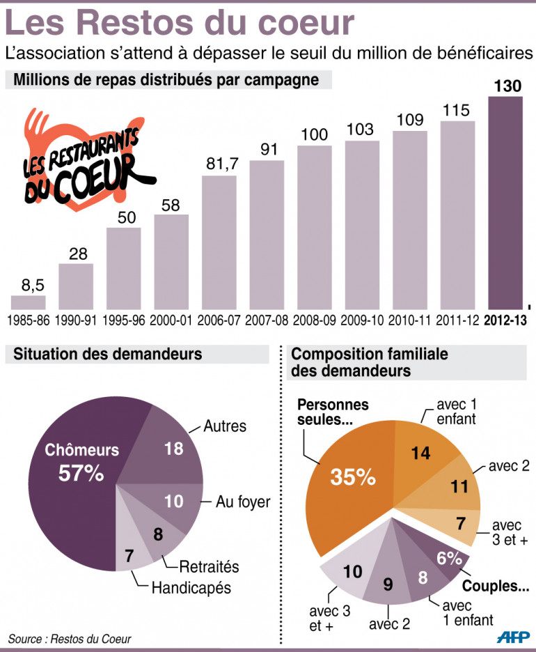 Lors de la campagne 2013-2014, l'association créée par Coluche en 1985 a dépassé pour la première fois le million de personnes dans ses centres, et servi 130 millions de repas.
