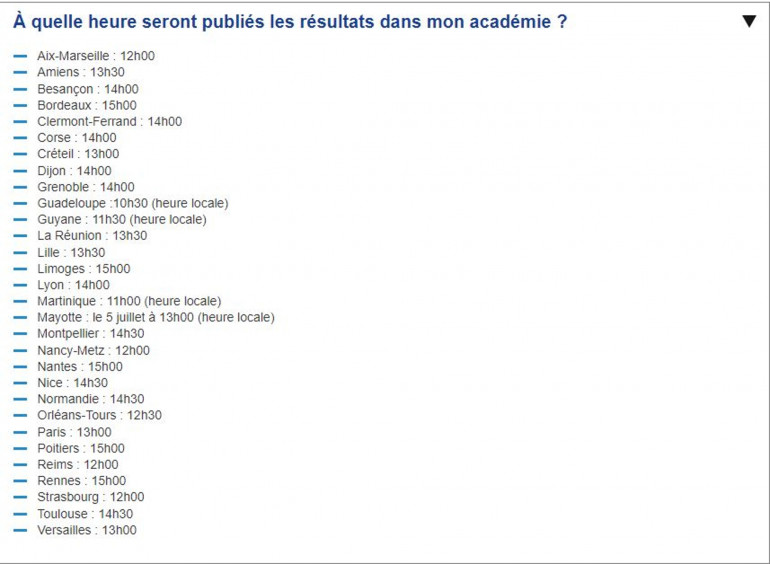 L'heure de la mise en ligne des résultats dépendra de l'académie, peut-on lire sur le site du ministère de l'Éducation nationale. En effet, dans l'Hexagone, ce seront les académies d'Aix-Marseille, Nancy-Metz, Reims et Strasbourg qui ouvriront le bal à 12h, puis Orléans-Tours à 12h30.