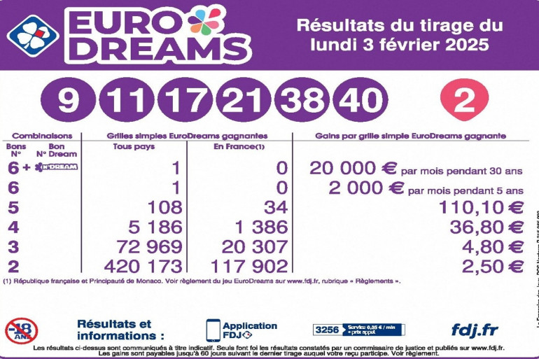 Selon les résultats de l'EuroDreams, publiés par la Française des Jeux, le tirage des numéros gagnants de ce lundi 3 février 2025 est le suivant : 9 - 11 - 17 - 21 - 38 - 40. Le numéro Dreams du jour est le 2.