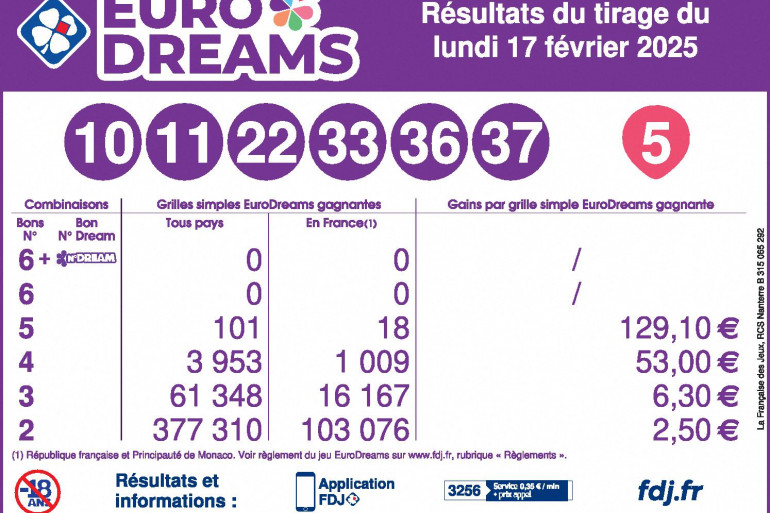 Selon les résultats de l'EuroDreams, publiés par la Française des Jeux, le tirage des numéros gagnants de ce lundi 17 février 2025 est le suivant : 10 - 11 - 22 - 33 - 36 - 37. Le numéro Dreams du jour est le 5.