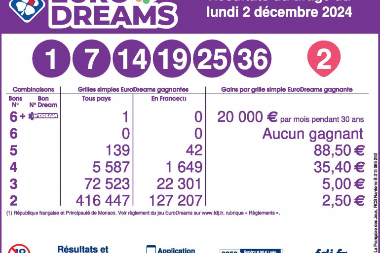 Selon les résultats de l'EuroDreams, publiés par la Française des Jeux, le tirage des numéros gagnants de ce jeudi 28 novembre 2024 est le suivant : 1 - 7 - 14 - 19 - 25 - 36. Le numéro Dreams du jour est le numéro 2.