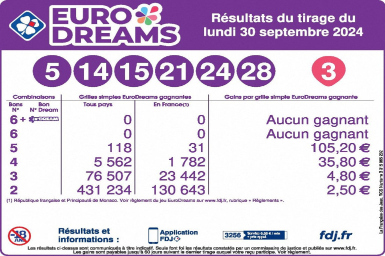 Selon les résultats de l'EuroDreams publiés par la Française des Jeux, le tirage des numéros gagnants de ce jeudi 26 septembre 2024 est le suivant 5 - 14 - 15 - 21 - 24 - 28. Le numéro Dream est le n°3.