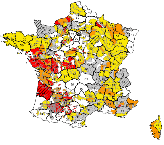 La majeure partie des départements sont concernés par l'alerte (en jaune sur la carte), deuxième stade de restriction. Cela implique la réduction des prélèvements à des fins agricoles inférieure à 50%, des mesures d'interdiction de manœuvre de vanne, d'activités nautiques. Il est également interdit d'arroser les jardins et espaces verts à certaines heures de la journée. Le Pas-de-Calais, l'Isère et la Creuse sont visés par cette alerte.