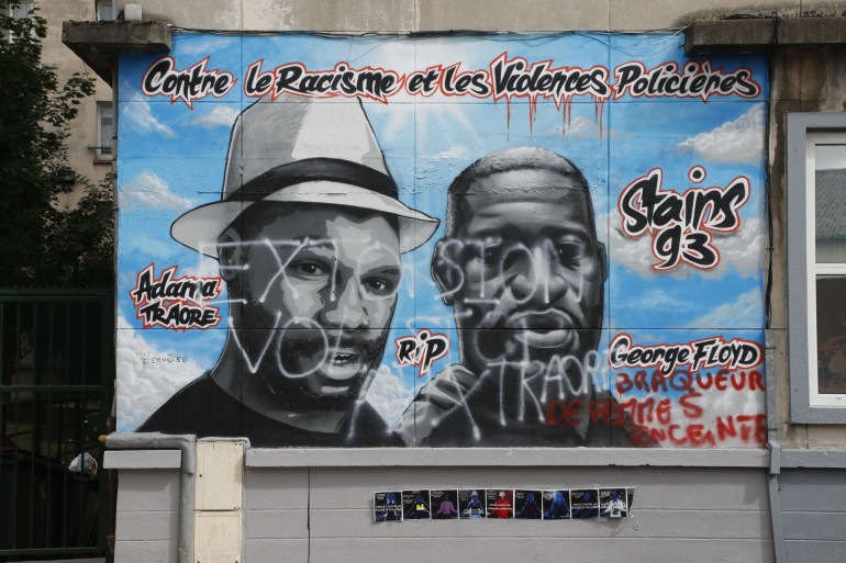 "Extorsion", "vol", "stop aux Traoré". La fresque réalisée à Stains en Seine-Saint-Denis en hommage à George Floyd et Adama Traoré a été vandalisée dans la nuit de samedi à dimanche 5 juillet, a-t-on appris auprès d'une source préfectorale.
