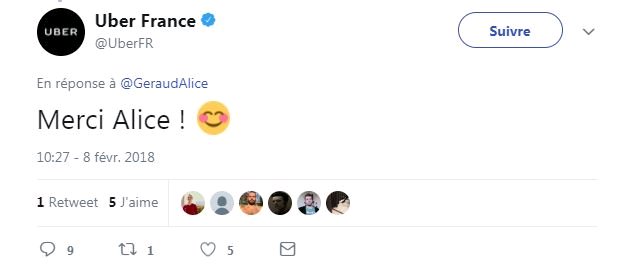 "Une vision intéressante et progressive" ironise Alice Géraud, journaliste aux Jours, qui a repéré la campagne publicitaire jeudi 8 février. Sur Twitter, elle interpelle Uber. Mais l'entreprise ne semble pas saisir l'enjeu de la remarque et lui répond un simple "merci" - le tweet a été supprimé depuis.
