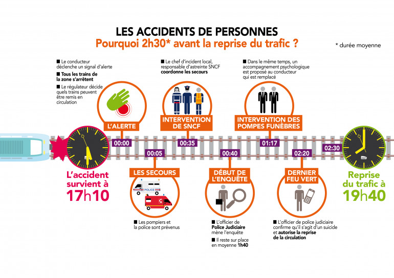 Aussitôt l'alerte signalée par le conducteur, tous les trains de la zone doivent s'arrêter. Un régulateur décide alors quels trains peuvent poursuivre leur chemin. Parallèlement à ça, les services de secours, policiers et gendarmes, sont avertis et se rendent sur place dans les cinq minutes qui suivent le signalement, coordonnés par un responsable d'astreinte SNCF. Vient ensuite le début de l'enquête, menée par un officier de police judiciaire qui reste environ 1h40 sur les lieux. Il doit confirmer, si c'est le cas, qu'il s'agit bien d'un suicide et peut enfin donner l'autorisation de reprise de la circulation. Dans le même temps, le conducteur, systématiquement remplacé, se voit proposé un accompagnement psychologique.