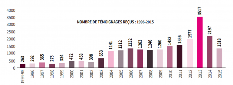 Nombre de témoignages reçus par SOS Homophobie entre 1996 et 2015