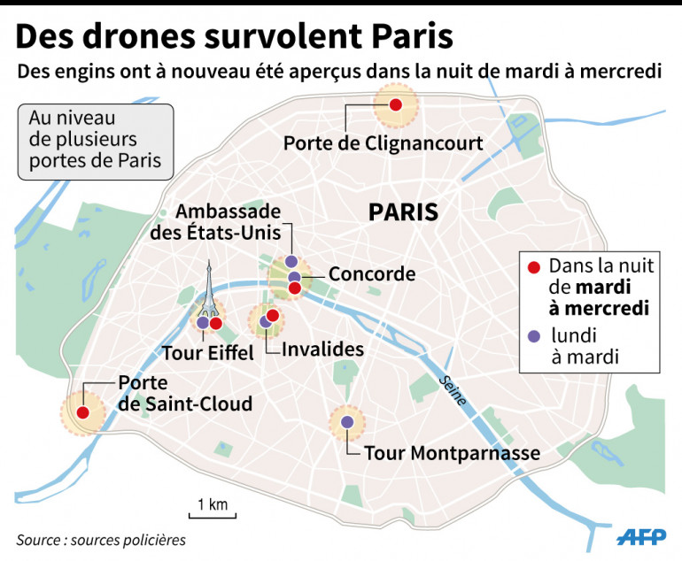 Par ailleurs, un restaurateur du nord-ouest parisien s'est fait confisquer son drone sur décision de justice ce mercredi, selon une source proche de l'enquête. L'homme avait été interpellé mardi sur dénonciation d'un voisin pour avoir fait voler son drone lundi soir à Paris. Aucun lien n'a été fait avec les survols mystérieux signalés cette nuit-là.