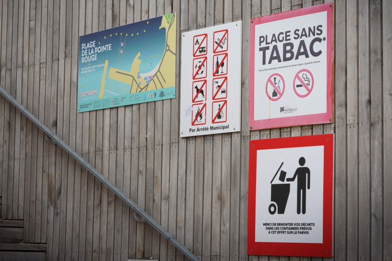 Affichage sur une plage sans tabac à Marseille, été 2023