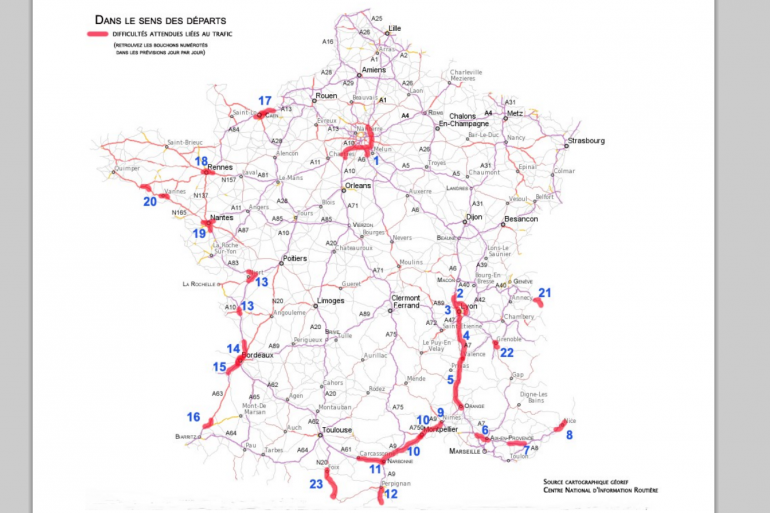 Dans le sens des départs : il faut éviter les autoroutes A7 et A8 entre Orange et l’Italie ainsi que l’autoroute A9 entre Orange et l’Espagne de 17 heures à 19 heures. L'A61 est à éviter aux mêmes heures.