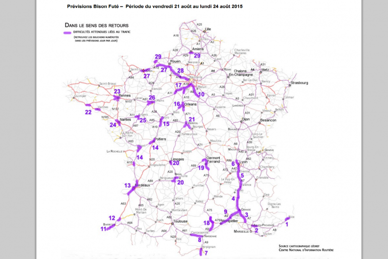 Les zones difficultés attendues par Bison futé du 21 au 24 août dans le sens des retours
