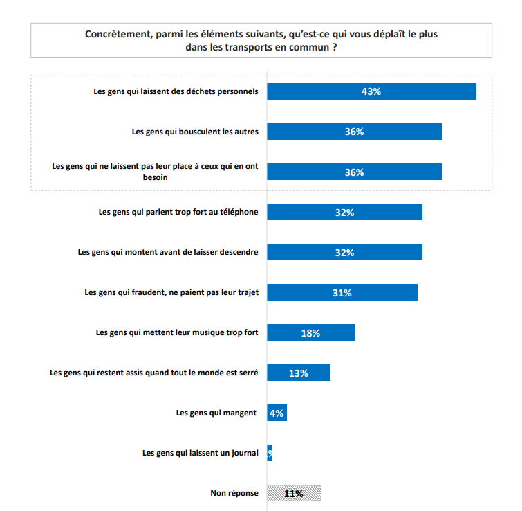 Ce qui déplaît le plus aux utilisateurs dans les transports, ce sont notamment "les gens qui laissent des déchets personnels" (à 43%) ou encore "les gens qui bousculent les autres" (à 36%).