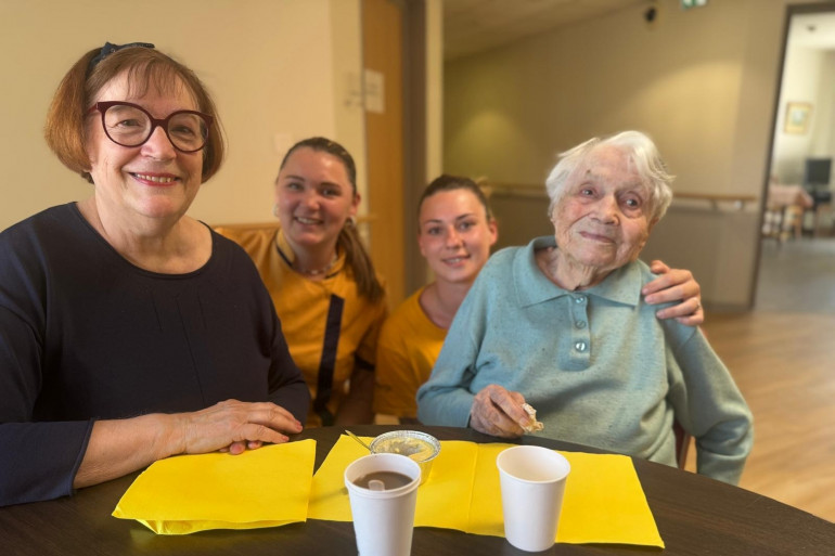 Marie-Rose vit à la maison de retraite des Sables-d’Olonne depuis 15 ans, depuis ses 100 ans et ici, c'est une mascotte que tout le monde adore. Manon et Maëva, deux aides-soignantes, la chouchoutent, "on s'entend super bien", déclare une soignante alors que sa collègue ajoute qu'"elle a son caractère, mais elle est sympa".