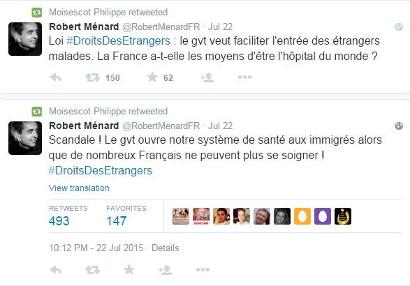 Les derniers en date sont des partages de tweets de Robert Ménard. "Scandale ! Le gouvernement ouvre notre système de santé aux immigrés alors que de nombreux Français ne peuvent plus se soigner. [...] Le gouvernement veut faciliter l'entrée des étrangers malades. La France a-t-elle les moyens d'être l'hôpital du monde ?", avait lancé le maire de Béziers le 22 juillet sur Twitter.