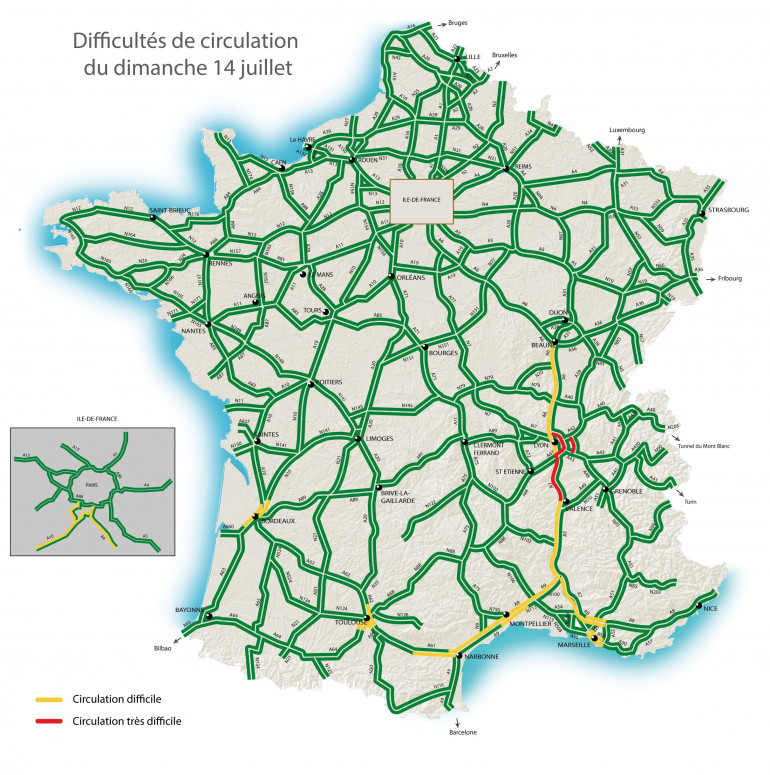La journée de dimanche est classée verte au niveau national, hormis en régions Bourgogne-Franche Comté et Auvergne-Rhône-Alpes classées orange. Il est recommandé d'éviter l'autoroute A7 entre Lyon et Orange, de 9h à 18h.
